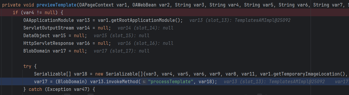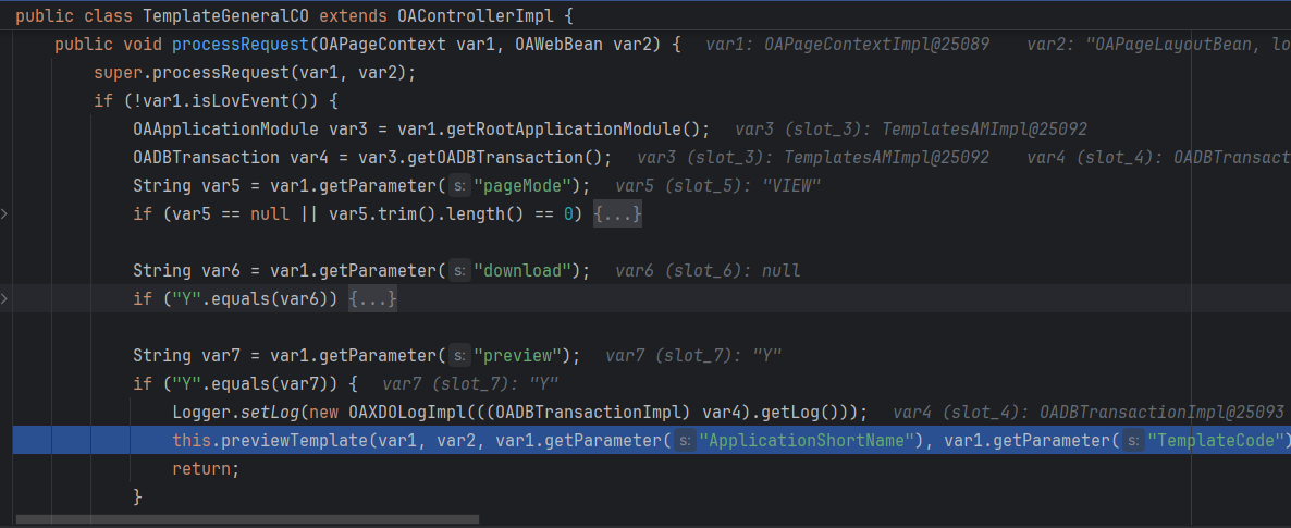 tại TemplateGeneralCO.previewTemplate(), tiếp tục check xem có tồn tại param TemplateCode nếu có sẽ gọi tới TemplatesAMImpl.processTemplate() → TemplateHelper.processTemplate() → TemplateHelper.runProcessTemplate().